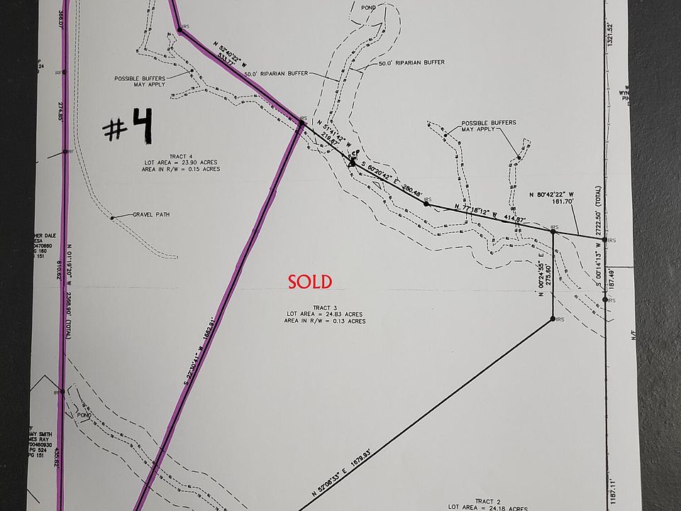 23.90 acre tract, Lot 4, Flat Rock Road - replanted Loblolly's that are expected to grow 2-3 feet per year. Reforested to the highest forestry recomendations. 3+ acres of cultivated cropland or pasture. Qualifies for deferred taxes. Survey, soil maps, and forestry plans on file. Well and septic needed. NO RESTRICTIONS! 3 lots in total available - you can purchase ALL 72 ACRES if desired - see the other MLS listings!