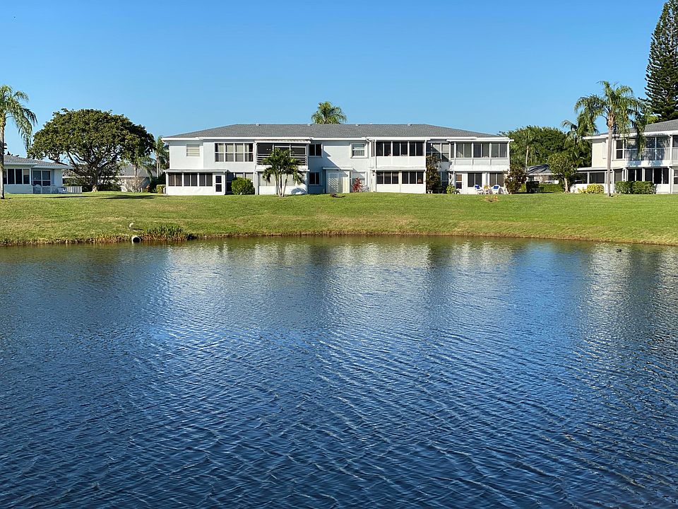 NO INTERIOR SHOWINGS UNTIL 3/4. RARELY available 1st floor corner LAKEFRONT! There's 1167 sqft under air plus you can enjoy the water views from your 160 sqft screened patio overlooking the lake. The patio is fully tiled and has 8 sets of 52'' tall slider windows; and there is also an under roof open patio in the front. It's tiled throughout, no wallpaper, plenty of paddle fans and a 29 ft long living room/dining area. There are PGT windows throughout unit and all with accordion shutters. The 17 ft long eat-in kitchen has granite countertops, granite backsplash, dual stainless steel sinks and most appliances are only 8 years old. The ac system is a 2-ton 16 Seer Carrier and there's a Square-D electrical panel. The building has a 2023 new roof and was painted in 2021. WELCOME TO THE PINES OF DELRAY WEST!