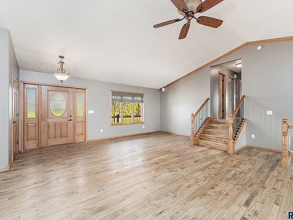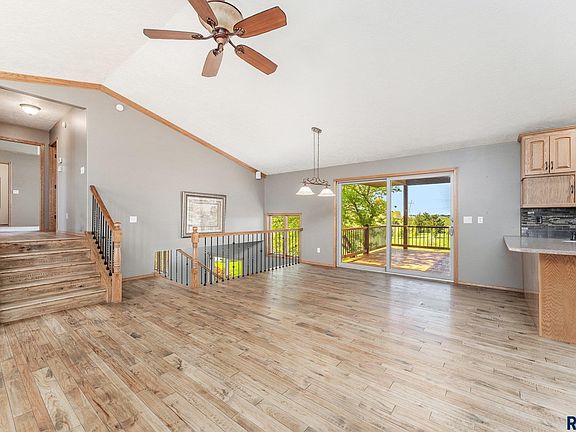 A beautiful home situated on 2.65 scenic acres overlooking a private pond in a quiet development 10 min. south of Sioux Falls. Entertain on your 16'x18' covered deck with radiant heat, plus a stamped concrete patio. Mature landscaping and a paver patio with firepit/waterfall to enjoy. The six-stall, insulated garage with dual heaters is a must for your hobbies/extra toys! (one 9ft garage door). Main level features gorgeous Hand scraped, oil rubbed, solid Hickory floors, an abundance of cabinets in the kitchen, black appliances, under counter light and vaulted ceilings. UL features a 19' x 13' primary suite including a spacious walk-in closet and a double closet, tiled shower, double sinks and laundry closet. Two more bedrooms and a full bath complete the upper level. The LL has 2 add'l bedrooms, 3/4 bath and spacious family room with gas FP. Basement level boasts a knotty pine game/TV room with w/ wet bar and large storage room. New shingles in 2023, new siding/paint in 2024
