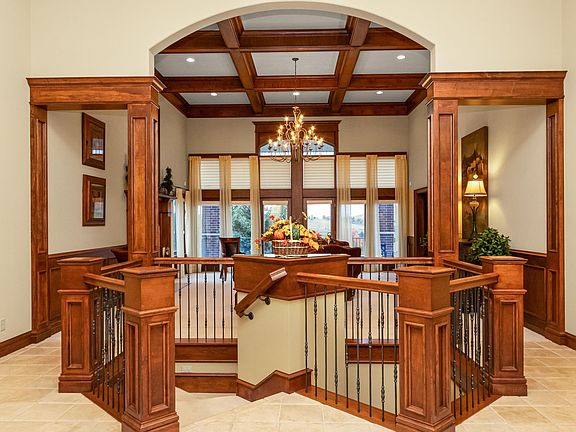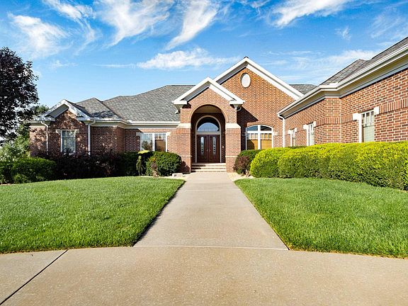 Incomparable quality! Incredible views! Magnificent brick rancher, impeccable finish work by Thierer Construction, Ebert Architect. Circle driveway, covered brick front porch, majestic tiled entry w/ 15’ ceilings. Living rm has natural lighting, 15’ wood-beamed ceiling, extra wide solid cherry crown molding & wainscoting, fireplace, walk out to covered deck spanning the length of house. Formal dining rm w/ wood flrs, BR/office w/French doors. Open kitchen w/ wood flrs, granite counters, cherry cabinets w/ rollouts; dining/hearth rm w/ 14’ vault ceiling, flr to ceiling wall of windows, stone fireplace, cherry entertainment center. Exceptional en-suite primary BR w/ 10’ coffered ceiling, large BA w/ dbl vanity, coffee bar, WP tub, 12’ vault ceiling, & 16’x11’ walk-in closet; 2 other en-suite BRs on main. Walkout LL has massive family rm, 2BRs, BA, fully equipped bar w/ granite counter, 3-sided FP, wall of windows, pool table, 1800 sqft storage w/(2) geo-thermal units, & cedar safe rm.