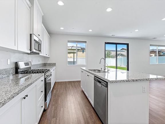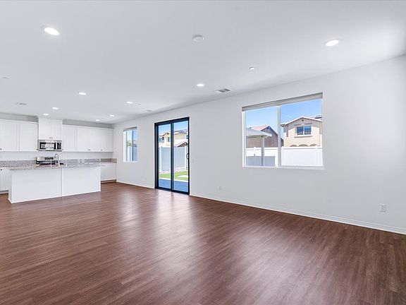 In Camden Place at Menifee Town Center, this spacious home offers a beautiful lifestyle with walkable amenities and quick access to I-215. The community boasts well-maintained trails, dog parks, a swimming pool, playground, and outdoor gathering spaces. Just a 0.6-mile walk from Menifee Countryside Market Place and Newport Plaza, this home is conveniently close to popular restaurants and shops. Inside, the house features an open floor plan with stunning espresso flooring, ample natural light, and a spacious living area perfect for relaxation or entertaining. The kitchen seamlessly connects with sleek countertops, creating an inviting space for meal preparation while enjoying the company of loved ones. The master suite is generously sized, complete with its own bath, shower, sinks, and closet. Upstairs, a loft offers additional living space. The backyard showcases low-maintenance pet friendly turf, a gazebo with a built-in projector screen, and electrical connections ideal for hosting outdoor parties, watching games, or enjoying movie nights under the night sky.