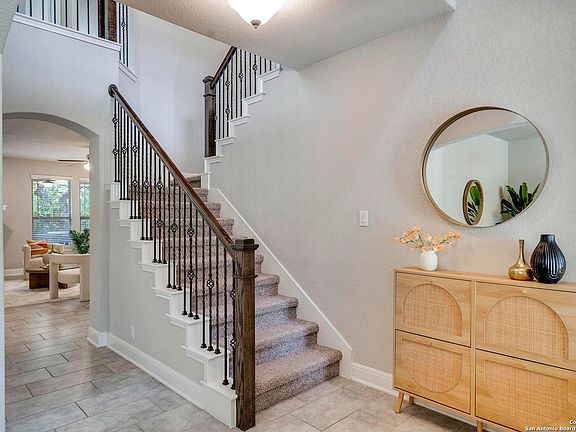 Welcome to this stunning home in FALLBROOK boasting 5 bedrooms and 3.5 bathrooms, this spacious 3,063-square-foot property offers the perfect blend of comfort and elegance. The heart of the home features an elegant kitchen with gorgeous granite countertops and plenty of cabinetry, large island, HUGE pantry & gas range, perfect for meal preparation and entertaining. The family room includes a gas fireplace and high ceilings throughout, natural light pours into every room, creating a bright and inviting atmosphere. The main level includes a private guest suite with an ensuite bath, ideal for visitors or multi-generational living. Upstairs, retreat to the luxurious primary suite complete with a spa-inspired bathroom, oversized walk-in shower, soaking garden tub, and a massive walk-in closet. Also upstairs: a spacious game room for movie nights or playtime, three additional bedrooms, and a full bathroom to accommodate everyone comfortably. Step outside to a serene backyard backing to a greenbelt-your own private escape. The extended covered patio offers the perfect setting for outdoor dining or relaxing with a cup of coffee. Fallbrook residents enjoy exceptional community amenities including a lagoon-style pool and park, just steps away. With easy access to IH-10, shopping, dining, and Boerne's top schools, this location truly has it all.