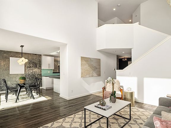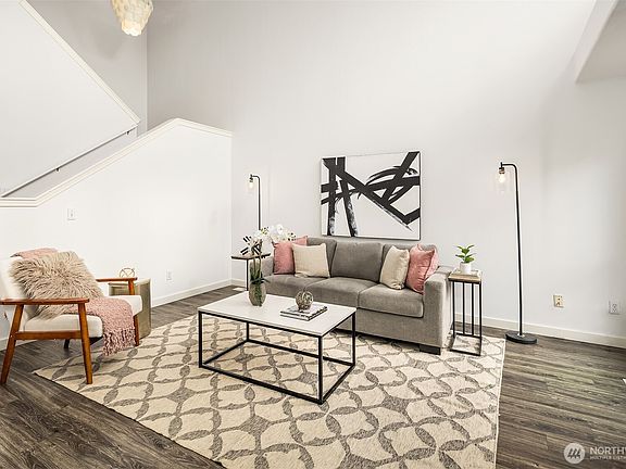 Step into this reimagined Rosemount townhouse where style, comfort, and convenience meet. The main level features soaring vaulted ceilings, a cozy gas fireplace, and abundant natural light from south-facing windows. A chef’s kitchen with quartz counters, high-end stainless appliances, and generous storage opens seamlessly to a formal dining area, deck, and fully fenced yard with low-maintenance astroturf—ideal for entertaining. A powder room and full laundry complete the level. Upstairs, the luxurious primary suite boasts a spa-like 5-piece bath and walk-in closet, joined by two spacious bedrooms and full bath. With a 2-car garage, central heating/cooling, and prime I-5 access, this home blends elegance with everyday ease.