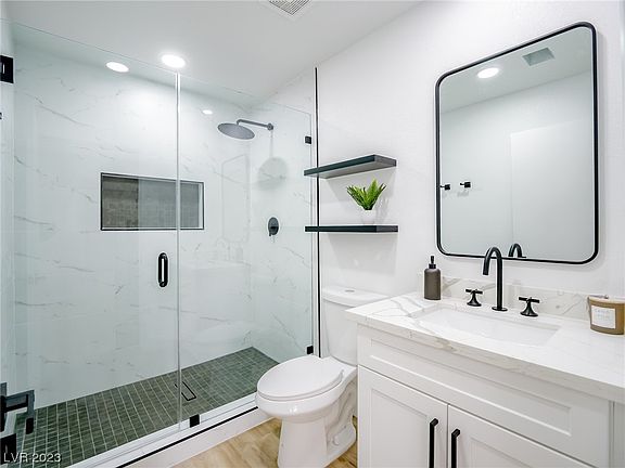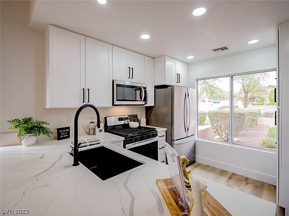 Luxurious Sun City Summerlin living without the hefty price tag! This home has been meticulously renovated & offers an abundance of amenities! The entire home is fitted with brand new white shaker cabinets throughout w/ beautiful new Calacatta quartz countertops! The kitchen features a stunning water fall peninsula w/ enough seating for 4 people! The stainless steel appliances are fresh out of the box & ready for their new owner! Most flippers never include a fridge, but not us! We are offering a full appliance package for you! Fridge included! Both bathrooms have been completely redone w/ gorgeous floor to ceiling tile walls & the primary bathroom has a beautiful frameless glass enclosure! This home is located within a minutes walk from all of the Sun City Summerlin shops, doctors & stores! Stay out of the heat because the HOA handles all of your landscaping! From style, location & convenience... everything you need is located right here at our Desert Crystal!