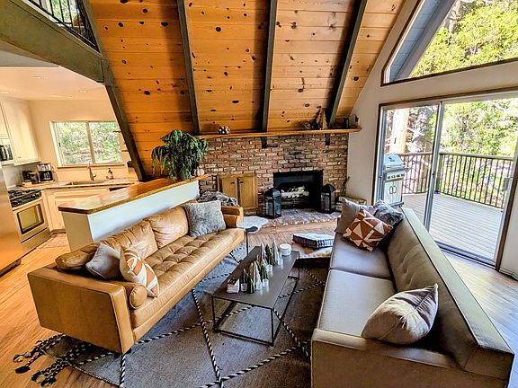 Welcome to your perfect mountain retreat in Lake Arrowhead! This home offers a blend of modern comfort and rustic charm, ideal for those seeking the ultimate mountain lifestyle. The spacious living area features a beamed ceiling and a stunning wall of glass that invites the beauty of the surrounding forest inside, providing a breathtaking view of the changing seasons. The open-concept kitchen, dining, and living room flow seamlessly onto a stylishly lit outdoor deck, perfect for entertaining with a gas BBQ.