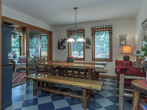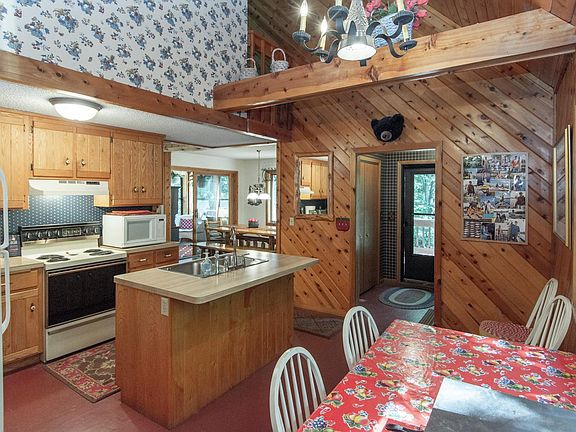 4.27 acres on Upper Mission Lake with 255 feet of lake shore very private setting. The cabin has 3 bedrooms and 3 bathrooms. The living room has a real stone Kozy heat wood burning fireplace and lots of tongue and groove knotty pine with a vaulted beamed ceiling. Off the living room is a large dining area with a screened porch that walks out to a very large wrap-around deck. The lower level is open with extra sleeping areas and walks out to the yard. There is a cart path down to the water’s edge. If you are looking for a private retreat this is it!! Furnishings are negotiable.