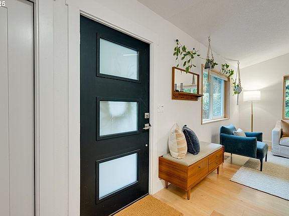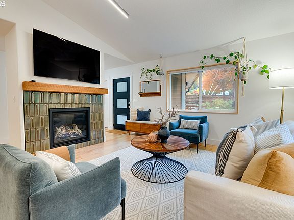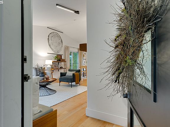 A Sanctuary Among The Trees. Experience the perfect blend of modern comfort, bespoke design, and forested serenity in this light-filled home. Open living and dining areas flow seamlessly to a deck overlooking lush, mature trees, while sustainably harvested hardwood maple floors, new wood doors, baseboards, and window/door framing throughout create a cohesive, warm aesthetic. The kitchen is thoughtfully upgraded with all-new appliances, a gas range with range hood, Cambria luxury quartz counters, and a new faucet and sink. The living room centerpiece is a fireplace featuring a gas insert, reclaimed wood mantle, and custom tile. Two spacious bedrooms and a spa-like main floor bath with soaking tub complete the main level, while the lower daylight basement offers a 3rd bedroom, tiled bath, laundry, and a large, light-filled family room. Indoor-outdoor living abounds with multiple decks and a custom cedar-lined hot tub room with floor-to-ceiling accordion doors that open to serene treetop views. Newly built decks and a stairway connect to a backyard paradise featuring redwoods, Douglas fir, plum trees, figs, vine maples, ferns, and a pond ready for fish or frogs in spring. Two high-quality yurts with Douglas fir flooring extend the living space, ideal for studios, guests, or quiet retreats. Additional updates provide peace of mind, including a new HVAC system with A/C, plumbing replacement, a custom steel driveway gate with remote opener, cedar fencing, hardscaped pathways, and updated exterior lighting. Solar panels for cost savings. Situated near Rocky Butte, Joseph Woodhill Park, and Dharma Rain Zen Center, this home offers access to stunning hiking trails and panoramic views. This unique sanctuary combines thoughtful design, modern upgrades, and a connection to nature, ready to delight from every angle. [Home Energy Score = 9. HES Report at https://rpt.greenbuildingregistry.com/hes/OR10242490]