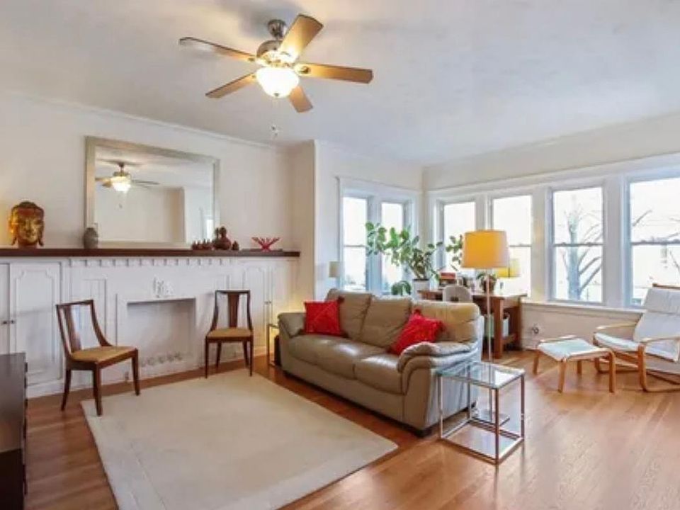 Expansive living room with 7 windows overlooking a quiet tree-lined street