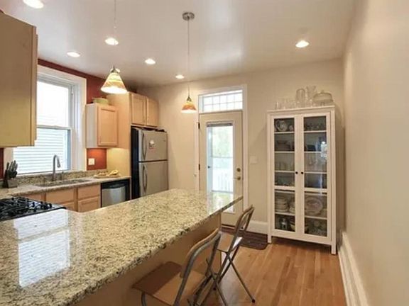 Kitchen features granite countertops, new cabinetry, stainless steel appliances, and walk-in pantry