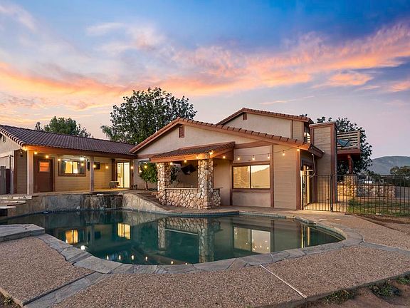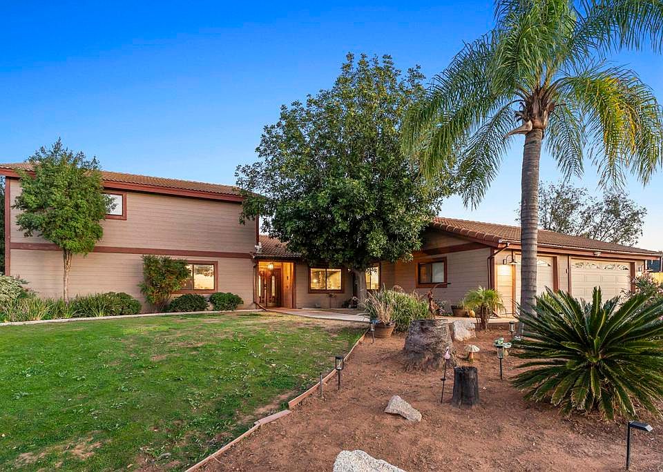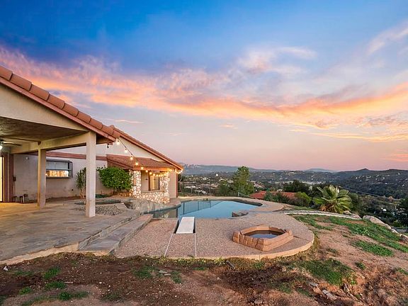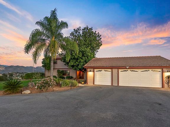 Welcome to your private retreat in the peaceful rural community of Valley Center, offering sweeping 360° views and endless possibilities. This move-in-ready 4-bedroom + bonus room, 3-bath home features 3,114 sq. ft. of living space on a remarkable 6.29-acre lot with multiple flat, usable areas—ideal for those seeking space to grow, build, or enjoy outdoor living. Pack up the Kids, Animals (large and small) and utility Vehicles there is room for it all plus more. Thoughtful upgrades and modern features set this home apart, including fully paid solar (44 panels, 12.32 kW), a Tesla car charger, a sparkling saltwater pool, fresh interior paint, new LVP flooring, updated wood siding, and more. Inside, the functional split-level floor plan offers generous living spaces. The main level highlights an expansive kitchen with island seating, freshly painted cabinetry, recessed lighting, crown molding, and abundant storage. A large open pantry and flex space off the kitchen provide even more cabinetry and direct access to the garage, patio, and pool. The adjacent dining area is perfect for family meals or entertaining. A spacious 5th bedroom/bonus room (currently within the garage area) offers excellent versatility and can be easily converted back to a 3-car garage if desired. Step down into the sunken living room featuring a striking stone fireplace, new luxury vinyl plank flooring, ceiling fans, and access to both the backyard and side yard, the original ceiling was open beam and can be reopened if new owner prefers. The backyard is an entertainer’s paradise with a saltwater pool, pebble-tec finish, flagstone coping, Jacuzzi, and a sunken bar—perfect for hosting or unwinding in your own private oasis. Upstairs, the expansive primary suite impresses with a massive 40' x 28' flexible layout—ideal as two separate rooms, a bedroom with sitting area, or a multi-generational living space. Enjoy spectacular sunrise views from the private deck. Downstairs, three additional bedrooms include a second primary suite with its own en-suite bath, offering comfort and privacy for guests or extended family. Outdoors, the opportunities are truly endless. The 6.29 acres of mostly flat, usable land include two separate accessible levels, perfect for adding a shop, ADU, shed, or storing equipment. There is also potential for a lot split, with a second driveway and access point already in place. With its unmatched land, views, and versatility, this Valley Center property is an exceptional investment and a rare chance to create your dream lifestyle.