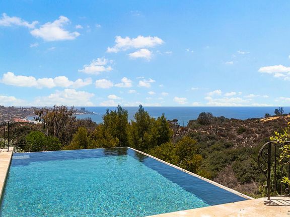 A serene setting of exceptional privacy and beauty awaits at this extraordinary North La Jolla estate, where sweeping views of the ocean, canyon, and La Jolla Cove create a priceless backdrop. Quality craftsmanship and a breathtaking design aesthetic define the luxe interior, which offers 3 en suite bedrooms plus an optional 4th, a climate-controlled wine cellar, sauna, and walls of windows showcasing the surrounding scenery. The light-filled foyer introduces soaring beamed ceilings with skylights, antique herringbone pavers, and double iron doors enhancing the inviting indoor-outdoor flow. Expansive entertaining spaces include a voluminous living room crowned by a barrel vault ceiling, a formal dining room overlooking lush greenery, a fully equipped chef's kitchen with custom cabinetry, and a family room/library with cathedral ceiling, abundant bookshelves, and one of five fireplaces. Each bedroom boasts a spa-like bath, including the private primary retreat. A large flex space with its own bath and sauna could serve as a 4th bedroom. Outdoors, a sprawling stone patio with fireplace and infinity-edge pool invites effortless enjoyment of La Jolla's year-round climate. Situated on a cul-de-sac in the Upper Shores with convenient access to beaches, UCSD, shops, and UTC. Available at $25,000/month unfurnished with a year lease.
