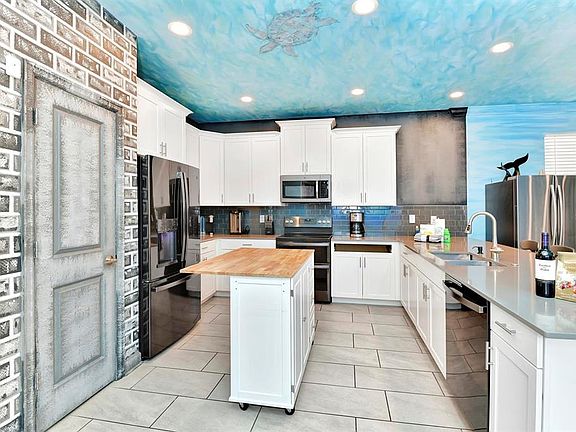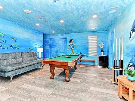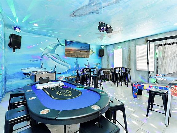 Don't miss this opportunity, this is truly a ONE-OF-A-KIND vacation home! This beautiful 9-bedroom, 5-bathroom home is a work of art with the entire home's interior painted by a professional artist with an aquatic theme. Located in Storey Lake, one of the most popular vacation rental communities in the Central Florida, it's just minutes to the Disney entrance. The home has a fantastic location within the community as it's just a 2-minute walk to the fabulous clubhouse and amenity center! The home is being sold fully furnished and it offers loads of space to entertain and features an open concept floor plan. The kitchen has quartz counter tops, 42" white cabinets, beautiful black appliances and a large breakfast bar. All the bathrooms have waterfall shower panels and LED lighted mirrors. The huge combination living room and dining room make it the perfect home for large groups and family gatherings and there's a magnificent games room for everyone to enjoy as well as a karaoke room! It even has 2 water heaters so guests with large groups will never run out of hot water! It features a massive covered lanai with an outdoor kitchen for those afternoon cook outs, a brick paver deck and large heated pool and spa, and best of all it backs up to a conservation area so there are no rear neighbors!...This premier vacation resort community offers top of the line amenities including a grand clubhouse with concierge services, a restaurant and Tiki bar, resort style swimming pool and spa with a lazy river, water slides and cabanas surrounding the pool, an arcade, fitness center, business center, and even a theater! Storey Lake has a great location with easy access to Disney, Universal, Sea World and all that Central Florida has to offer! This home has to be seen to be believed!