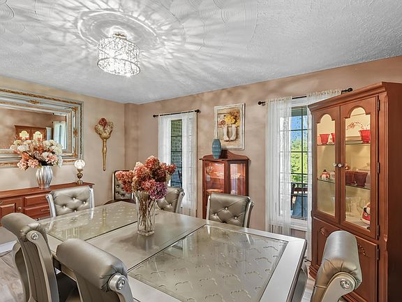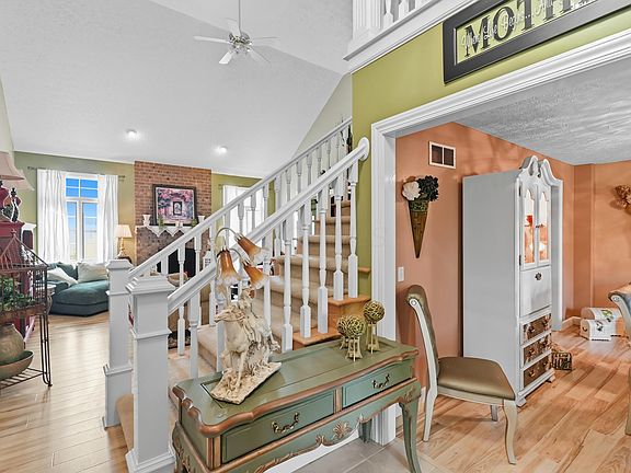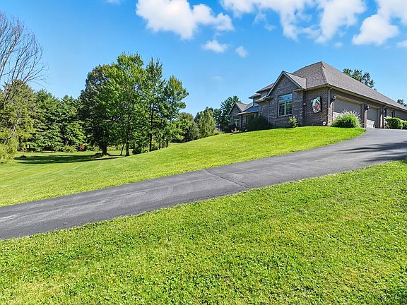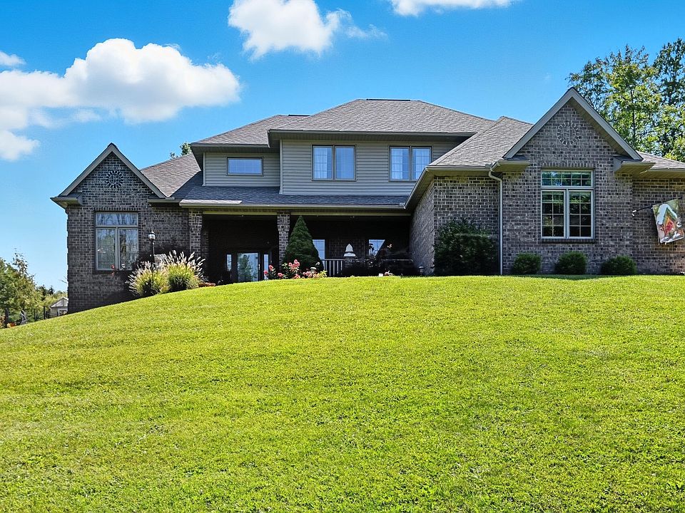 Country hilltop views await you in this 4,408 sq. ft. home with a walkout, partially finished basement. The main floor offers a laundry/mudroom just inside the garage entrance and an elegant foyer that welcomes guests into a beautiful living room with a brick fireplace. A separate dining room provides space for entertaining. The primary suite features cathedral ceilings, a walk-in closet, step-in shower, and a jetted tub to melt stress away. The walkout basement includes a spacious rec room with a built-in media area, a full bath, dedicated home office, and a fourth bedroom. Outdoor living can be enjoyed from the covered front porch or open back patio, both perfect for relaxing in the peaceful setting. A chicken coop and 8x12 greenhouse are also included, making this property a perfect blend of comfort and practicality. Don't miss this opportunity—schedule a showing today!