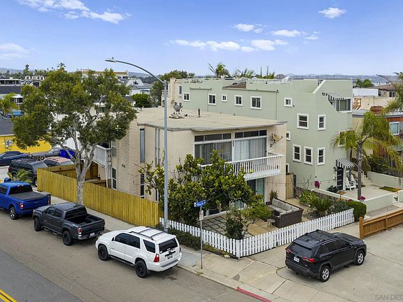 Welcome to this modern interior designed single level beach home. You will love the spacious two-bedroom, two-bath which was completely renovated in 2022. The open-concept layout creates an expansive great room that is ideal for both relaxing and entertaining. The gourmet kitchen features premium white cabinetry, stone countertops, and black stainless steel appliances. The living space extends outdoors to a huge private patio area, providing a seamless indoor-outdoor lifestyle. Primary bathroom has dual vanities and both bathrooms have custom, built-in showers. This home comes fully equipped with high-end furnishings, a rare bonus for the new owner or vacation rental. Full washer/dryer in the closet. It includes two dedicated parking spaces: a one-car garage plus one assigned spot.You are steps away from the sandy beaches, Belmont park and a quick drive to Seaworld and downtown. No HOA fee.