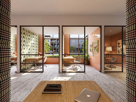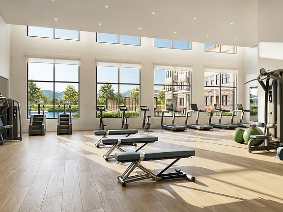 Each apartment at The Moraine features modern finishes, including quartz countertops, designer tile backsplashes, custom cabinetry, under-cabinet lighting, stainless steel appliances, spacious living rooms, pendant lighting, large walk-in closets, and private balconies with mountain views. The community amenities feature a clubhouse with floor-to-ceiling windows, a fitness center with mountain views, a yoga and spin studio, a spa with a sauna and cold plunge, an outdoor pool and lounge deck, coworking spaces, a beer tap wall, a dedicated dog park, and a bike and ski workshop with secure storage.