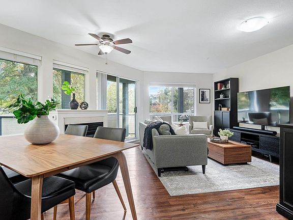 ELEVATED first floor condo surrounded by mature trees for privacy, southwest exposure- this quiet corner unit has easy outside access to walk the dog. Large kitchen w/upgrades include (2023) new subway tile backsplash, countertops, and professionally painted cabinets, d/w brand new. Spacious bedrooms, master has large W/I closet with plenty of storage and features a private balcony as well. Gas fireplace in Livingroom that opens to wrap around balcony. Laminate flooring throughout. Bathrooms also updated 2023. Above garage so no downstairs neighbors to disturb, secure parking and storage locker, short walk to groceries, bank restaurants and shops and pool with waterpark, schools nearby. Bus stop right out front. Public Open House Sunday Oct. 26 2-4PM