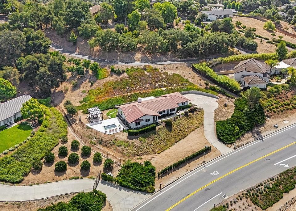 Located in the picturesque Gird Valley, right across from the new Monserate Winery in Fallbrook, this impeccably maintained 3-bedroom, 2-bathroom home offers 2,122 square feet of inviting living space. Natural light fills the home, enhancing the spacious layout, which includes two distinct living areas—one featuring a charming stone fireplace. The open and bright kitchen features new quartz countertops and top of the line stainless steel appliances, a cozy breakfast nook and a separate dining area. The bedrooms are thoughtfully positioned away from the main living spaces, providing privacy. The expansive master suite includes an ensuite bathroom with both a bath and a separate shower. New interior doors, fixtures and recessed lighting. Newer energy efficient windows. Enjoy stunning vineyard and sunset views from the newly added cocktail pool and natural stone tile terrace, with covered lounge areas perfect for gatherings. Close to many recreational and dining options.