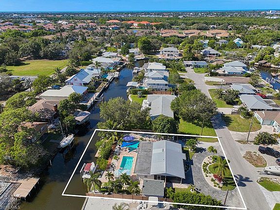 Discover a boater's paradise at 2736 Riverview Drive in the sought-after Gulf Shores community of Naples, Florida. This stunning waterfront property offers an unparalleled coastal lifestyle with its oversized lot boasting 97 feet of water frontage and direct access to the Gulf of Mexico. Nestled in the vibrant Bayshore Arts District, this beautifully renovated 2-bedroom, 2-bathroom home provides 1,484 square feet of thoughtfully designed living space. The residence showcases quality concrete block construction with a durable metal roof, ensuring longevity and low maintenance. Step inside to find a completely reimagined interior featuring an open floor plan that seamlessly blends style and functionality. The custom kitchen is a chef's dream, boasting a spacious eat-in area, induction stove, and a stunning oversized island with quartz countertops. Elegant backsplash and a custom hood complete this culinary haven. The master suite is a true retreat, offering ample space and privacy. It features an oversized walk-in closet with a shelving system, a separate entrance from the pool deck with a convenient mud room, and a luxurious bathroom with a huge walk-in glass shower and dual vanities. Outdoor living is elevated to new heights with the addition of a sparkling pool and spa in 2021. The expansive paver patio provides plenty of space for lounging and entertaining, while a separate screened-in lanai with cable hookup offers a bug-free outdoor experience. Recent upgrades include impact-rated windows and doors (2023), a new HVAC system (2023), and completely renovated plumbing throughout. The home also features wide wood-like planking tile floors, a high-efficiency air conditioning system with humidistat, and a fully fenced yard for privacy and pet-friendly living. Boating enthusiasts will appreciate the private floating dock and boat lift, both equipped with freshwater spouts for easy cleaning. The side yard boasts a custom sport court perfect for bocce or cornhole, adding to the property's recreational appeal. Located on a quiet dead-end street, this home offers tranquility while being just minutes away from Downtown Naples, pristine Gulf beaches, shopping, and dining. The property is within walking distance to local attractions such as Celebration Park, the Botanical Gardens, and the home of the U.S. Open Pickleball Championships.
