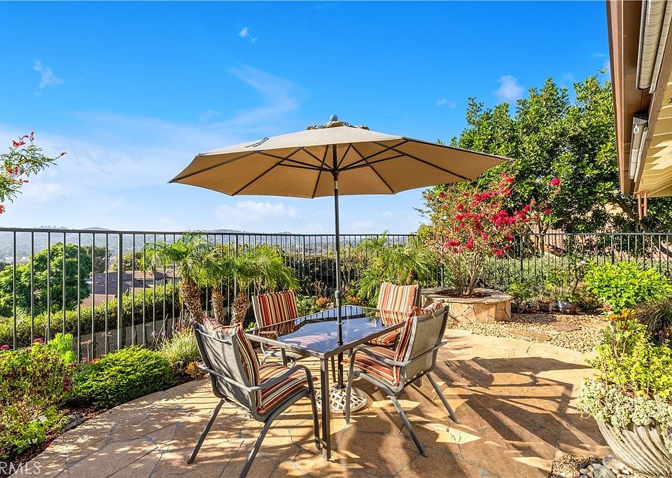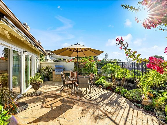 Hear the Mission Bells and Feel the Cool Coastal Breezes from this chic 3-bedroom, 2-bath plus LOFT residence perfectly positioned on a quiet cul-de-sac with beautiful views of the historic San Juan Capistrano Mission. This beautifully updated home captures the essence of the indoor/outdoor California lifestyle and LIVES LIKE A SINGLE LEVEL! Enter through a private gated courtyard into a beautifully landscaped wraparound backyard featuring spectacular views, built-in BBQ, and inviting seating areas for relaxing or entertaining. Inside, the open and airy floor plan offers welcoming living and dining spaces anchored by a gas fireplace. Details include dual pane windows and sliding glass doors, laminate wood flooring throughout, updated kitchen and bathrooms. The fabulous kitchen showcases quartz countertops, wood cabinetry, recessed lighting, stainless steel appliances, and at counter seating for 3 overlooking the eating nook. All bedrooms are conveniently located on the main floor, while an upstairs loft provides a versatile bonus area—ideal for a home office, gym, craft or media room. The beautifully updated primary suite includes access to a private patio and a renovated bathroom featuring a beautifully tiled step-in shower with designer tile, a polished marble-topped vanity with dual sinks, custom lighting, custom mirror and a large walk-in closet. Additional 2 bedrooms are large enough to accommodate Queen sized beds. Secondary updated bathroom features a shower in tub, polished marble top vanity and tile floor. Other special highlights include direct-access two-car garage, newer A/C, and PEX repiping throughout. Views, privacy, and style combine in this exceptional Mesa Vista residence—nestled in the rolling hills of historic San Juan Capistrano with easy freeway access, three community pools, lush landscaping, RV parking options, and close proximity to award-winning schools, hiking trails, equestrian facilities, fine dining, and world-class beaches. Welcome Home!