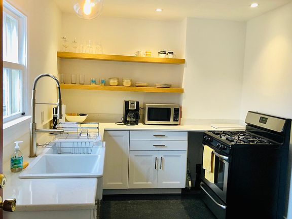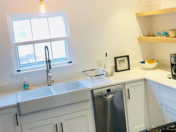 Fully remodeled kitchen with solid countertops, farmhouse sink, dishwasher, and updated appliances