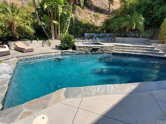 Updated two-story 4+2 nestled on oversized wooded lot with scenic mountain views from front yard. Wrought iron gated courtyard with koi pond & fountain affords privacy as well as security. Updated floor plan featuring spacious great room with fireplace open to remodeled island kitchen with Viking stove & granite counters. Recessed lighting, new carpet, fresh paint and large windows are featured thru-out. 3 bedrooms upstairs (1 currently being used as office) with 1 bedroom downstairs. Entertain or relax in the private, secluded backyard with huge covered patio, built-in bbq, many trees, gorgeous pool & spa. Great location, just minutes to Malibu, Pepperdine University & miles of hiking trails in Malibu Creek State Park.Award winning Las Virgenes School District!