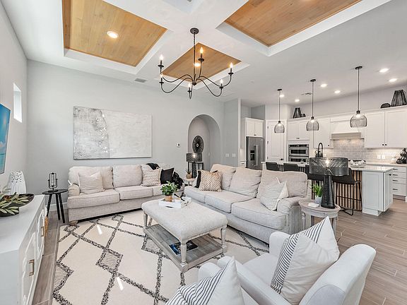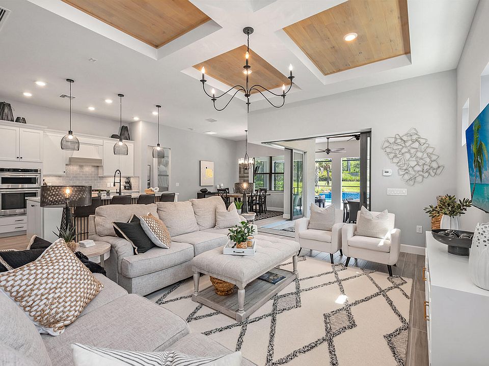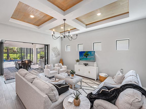 This masterfully designed 3-bed, 3-bath residence with den comes turnkey furnished in the award-winning community of Fiddler's Creek. Upon entry, you are greeted by 10-ft ceilings, 8-ft doors, impact resistant windows, and wood plank tile flooring throughout. The luminous white kitchen with quartz countertops, glass tile backsplash, large 4-seater island, and walk-in pantry is equipped with KitchenAid appliances, crowned by a gas cooktop. The adjacent living room features a wood plank coffered ceiling and zero corner pocketing sliding glass doors leading to an expansive screened-in lanai outfitted with electric storm shutters. Here, an outdoor kitchen with herringbone subway tile wall sets the stage for unforgettable gatherings. Dine alfresco and retreat to the plush sitting area for relaxation or lively conversations. The focal point, however, is the heated pool, complete with a sun shelf and adjoining spa. Fiddler's Creek residents enjoy luxury amenities that include a resort-style pool, championship golf, fitness center, tennis, pickleball, bocce, spa, sauna, fine/casual dining, social activities, and 24/7 security. Golf, beach, and marina memberships available.