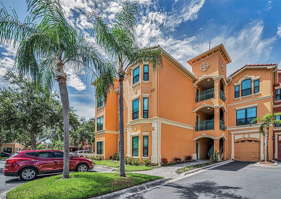 PRICE IMPROVEMENT...BEST VALUE in The Grand Bellagio, a Waterfront and Gated Community! This is the largest 2 bedroom floor plan featuring a under-building Garage, private Storage Room, Screened Balcony, and Bonus Room perfect for an office or 3rd bedroom. The open-concept floor plan boasts a spacious living room and separate dining area with abundant natural light. The modern kitchen features white cabinetry, granite countertops, stainless steel appliances, pantry, breakfast nook, and a breakfast bar for casual dining. Sliding glass doors lead to your screened balcony, ideal for enjoying morning coffee or evening breezes. The private primary suite offers balcony access, an oversized walk-in closet, and a fully renovated spa-like ensuite with a double vanity, custom-tiled walk-in shower with glass enclosure, and designer flooring. The guest bedroom is generously sized with bay-style windows, and the second full bath features a tub/shower combo and custom tile floors. Additional highlights include crown molding, high ceilings, inside laundry with full-size washer and dryer, and a welcoming foyer. Community amenities include a waterfront pool with cabanas and shaded entertaining area, elegant clubhouse and fitness center, spa, playground, tennis courts, community dock, and car wash station. Boat slips are available for purchase periodically. The Grand Bellagio is a 24-hour gated waterfront community ideally located just minutes from the Gulf beaches, top dining, shopping, entertainment, Tampa, and both airports. This condo truly checks every box, schedule your tour today!