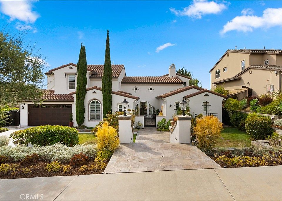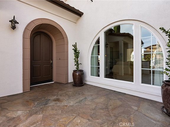 Blending timeless Spanish and Mediterranean influences, this residence is perched atop a ridge in the prestigious gated community of Rancho Madrina, showcasing panoramic views of the San Juan Capistrano hills, the historic Mission, and Marbella Golf Course. One of the community’s most sought-after floor plans, it features an oversized main-level primary suite thoughtfully positioned in its own private wing, with a versatile upstairs loft ideal for an office, gym, or lounge. A gated front courtyard framed by manicured landscaping sets the stage for refined craftsmanship throughout, where soaring beamed ceilings, a dramatic fireplace, glass doors, hardwood floors, crown molding, solid core doors, and custom built-ins define the great room and interior spaces. The gourmet kitchen boasts granite countertops, recently updated JennAir appliances, a beverage station, and spacious pantry, while the entertainer’s backyard offers a custom pool with waterfall features, spa, built-in BBQ, fire pit, and surround sound extending indoors and out. Additional highlights include a private office, dual-level laundry, upgraded HVAC, a 3-car tandem garage with epoxy flooring and garage doors replacement, epoxy-coated pipes, and freshly painted exterior—Ideally located near historic Downtown San Juan Capistrano, with easy access to Orange County’s beaches, parks, shopping, and major highways.
