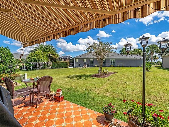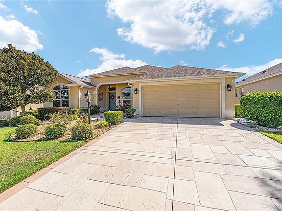A Designer Sanctuary in The Villages with an Offset Homesite! Welcome to this exquisite Gardenia Model home in the sought-after Village of Hemingway, ideally located just minutes from Lake Sumter Landing’s nightly entertainment, premier shopping, many wonderful dining options, golf courses, recreation centers, and several golf cart accessible pools. Thoughtfully designed and beautifully updated, this 3-bedroom, 2-bath residence embodies both elegance and comfort. The home showcases a timeless block stucco exterior complemented by a newly painted finish, new roof, gutters surrounding the home, and a custom-designed, sealed driveway and walkway. Inside, the split-plan layout provides both privacy and flow, featuring hardwood floors in the great room and primary suite, crown molding in every bedroom, and plantation shutters throughout. A gourmet-inspired kitchen is highlighted by upgraded granite countertops, an expanded island with additional storage, deep farmhouse sink, tile backsplash, under-cabinet lighting, and new stainless-steel appliances including a refrigerator, dishwasher, and microwave. Both bathrooms are equally refined with granite countertops, blending style with functionality. The adjoining dining and living spaces open to an enclosed patio with sliding windows and tile floors, offering year-round enjoyment. Step outside to a serene tiled patio with retractable awning—perfect for relaxing afternoons. One of this property’s most coveted features is its premium offset lot—providing enhanced privacy, no “kissing lanais,” and a tranquil backdrop of beautiful landscaping, creating a true sanctuary both inside and out. Additional enhancements elevate the home’s functionality and style: a designer closet system, laundry room with sink and cabinets, solar tube in the guest bath, tinted windows in key rooms, luxury vinyl flooring in the study and guest bedroom, garage cabinets with workbench, pull-down attic ladder, and a coated garage floor. For peace of mind, the property also features an ADT security system. Blending modern upgrades with refined finishes, this residence is more than a home—it is a private retreat designed for luxurious living in the heart of The Villages.