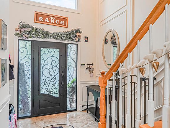 A dramatic two-story foyer with sweeping staircase and chandelier sets the tone, leading to a spacious formal living and formal dining room, an eat-in kitchen, and an adjoining family room with sliders to the backyard. Hardwood and tile floors and nine-foot ceilings run throughout. This highly functional living space is ideal for modern living.