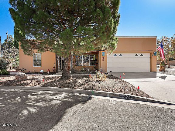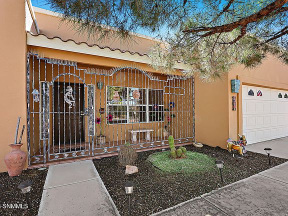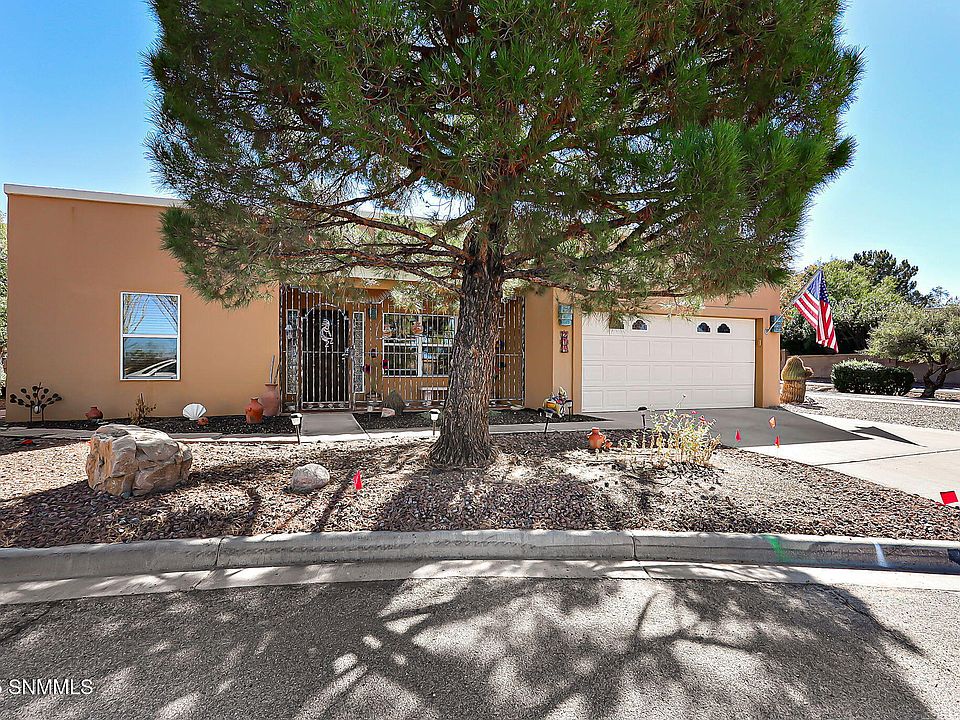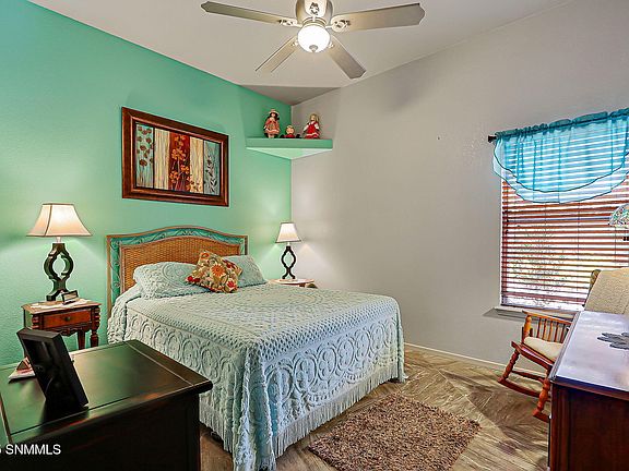 Charming home featuring a wrought-iron entry that opens to a spacious living and dining area with 13-ft ceilings and a cozy corner fireplace. The open kitchen offers abundant cabinet space, granite countertops, a skylight, and a dining nook. Three bedrooms include a primary suite with a block-glass walk-in shower and dual shower heads. The main bath features granite counters. Enjoy tile flooring and ceiling fans throughout, plus an indoor laundry room for added convenience. Outside, relax on the large tiled patio with ceiling fans, roll-up sunscreens, and a powered workshop. The corner lot offers easy-care landscaping with shrubs, trees, and decorative colored rock. Durable CPA/PVC thermoplastic single-ply membrane roof for long life. Located in a well-established neighborhood close to MountainView Regional Medical Center, shopping, and walking trails.