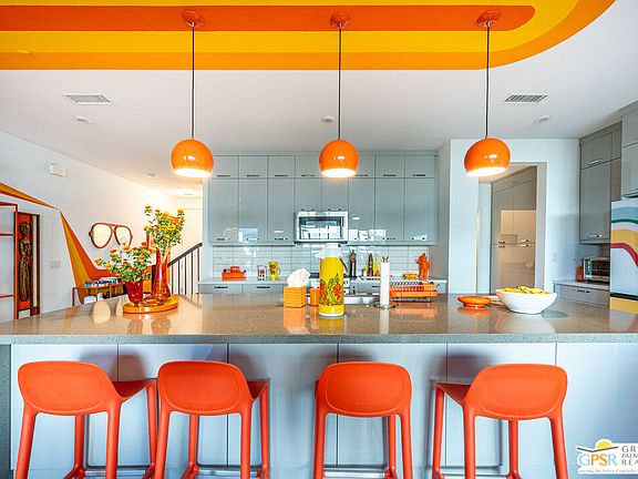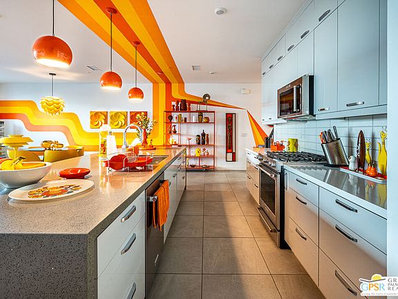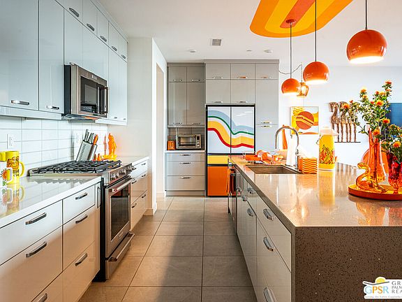274 Mayfair welcomes you into a stunning world of color and design. Located within the Toll brothers built gated community of Cody Place, this 2237 square foot "Cameo Elite" plan home has a generous open kitchen with living and dining in one great space. The kitchen has upgraded cabinets featuring a second row of upper cabinets to the ceiling, and pull-out spice racks on either side of the Kitchen Aid gas range. The 12 ft by 4 ft island has a deep stainless sink and a Kitchen Aid stainless dishwasher. The Samsung Bespoke refrigerator has color panels that match the hand painted super graphic that envelopes the entry way and leads to the dining area. The living room has a 3 panel 8"x 12' slider leading out to the private yard and saltwater spool with lounging shelf. On the second level, up a grand carpeted staircase, lies a bright sun-filled loft office/den space with a 12 ft ceiling and adjacent balcony. A guest bedroom is next to the loft with an adjacent full bathroom with a walk-in, tiled shower, and the laundry room with stacked LG washer and drier. Around the stairwell through a vestibule with storage cabinets, is the roomy primary bedroom with another bright and beautiful supergraphic and a 12 ft by 8ft 3 panel sliding door that flanks another balcony that looks down to the private pool and yard, but also has views to the clubhouse and turquoise shared pools and large hot tub. Up the next flight of stairs with its clerestory windows creating a sunny atrium, a single lite door leads to the "elite" third floor outdoor entertaining room, covered to shield from the elements but open to the north with mountain and community views. This space invites indoor outdoor living in the fall, winter and spring months, complete with its own ceiling fan. The space could be used for outdoor TV watching and has a hose bib for potentially cultivating lots of potted plants. The sky's the limit! The townhome also features a two car garage with ample storage and a frosted glass garage door, and a powder room and additional storage tucked behind the kitchen. Cody Place sits conveniently on Palm Canyon Drive and is a short distance to downtown, and the bend district's restaurants and shops. The new CV link biking and walking path lies just north of the community which features its own clubhouse, outdoor kitchen with grill, lap pool, and recreational pool and spa. Honey, stop the search! You've found 274 Mayfair!