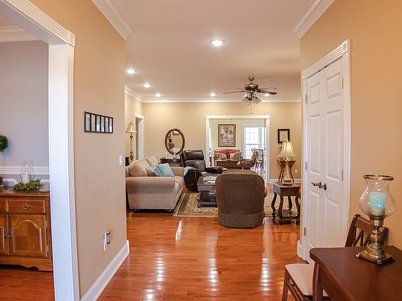 Beautiful 3 bed/2.5 bath, all brick, stately home for sale, located on a golf course in exclusive "Apache Heights" private neighborhood in Cadiz, KY, just minutes from Lake Barkley. This home was custom built by a renowned craftsman in 2005, and the beautiful finish work is shown from the exterior of the home to each individual room. Home boasts beautiful features such as ornate brickwork including standing soldiers and quoined corners, interior crown molding, wainscoting, and curved baseboards & trim, fine built-in shelving and cabinets in the living room around the gas fireplace (ventless). Yard has a buried water irrigation system throughout. Open concept design makes hosting large groups a charm. The large sunroom has french doors connecting to the living room. Home also has an open kitchen with an informal dining room with a high countertop between. The formal dining room is located adjacent to the kitchen and living room. Master suite boasts TWO large walk-in closets adjacent to the master bathroom. An office, study, or nursery room is located near the master suite. Hardwood floors run throughout the home, and tile in the bathrooms and washroom. Corian countertops in kitchen, stainless kitchen appliances including built-in double-oven and new dishwasher. Enjoy the large, 0.55 acre lot from the covered front porch or partially covered back patio! All kitchen appliances come with the home! (2 refrigerators (2nd located in wash room), NEW dishwasher, microwave, double-oven, & electric cooktop). All new LED lighting throughout the interior and exterior of the home. The gas furnace was replaced in 2016. "30 Year" shingled roof. A staircase runs to 600 sq feet of storage in the attic. Come and see this special opportunity! Please click on the Virtual Tour for more photos and an important message.