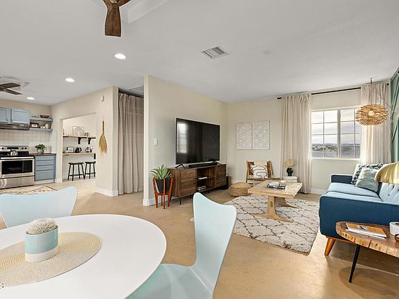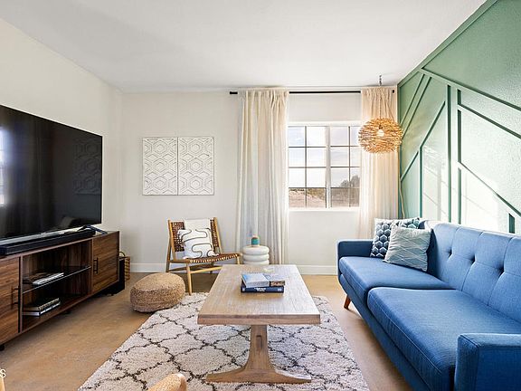 Welcome to 2740 Bagdad Hwy, a cozy and peaceful desert retreat sitting on five acres of scenic landscape. This two bed + two bath home was originally built in 1958 and has been updated with a host of chic and contemporary upgrades. Pale blue kitchen cabinetry and a unique accent wall add a sunny pop of color to the open layout. The concrete floors have been refinished and stained, and the interior and exterior have been freshly painted. Both bathrooms have undergone tasteful remodels, and the home's been updated with central air and heat as well as new ceiling fans. Just off the kitchen, the laundry room includes an adorable nook for breakfast or workspace. The generous front patio provides a landing space for relaxing outdoors, and the wraparound fence allows your furry friends to safely run around free outside. The property also comes with a large shipping container, which can either be used for storage or converted to bonus space. 2740 Bagdad Hwy is surrounded by watercolor skies at dawn and dusk and is just a stone's throw away from Joshua Tree National Park.