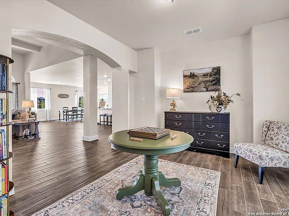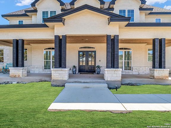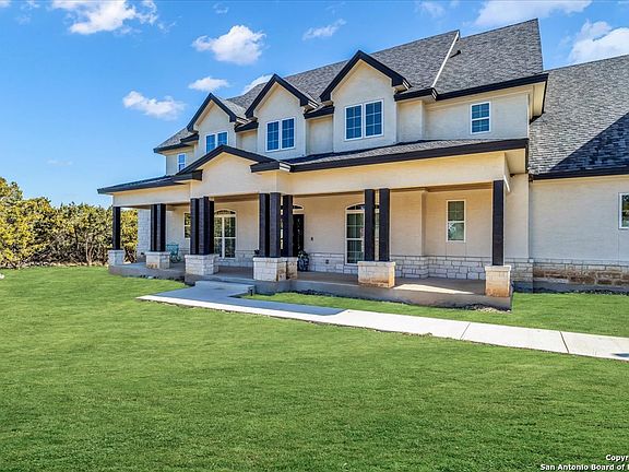 Nestled on a sprawling 1+ acre corner lot in the prestigious Ramble Ridge gated community, 27460 Sunset Loop offers breathtaking Texas Hill Country views and over 4,000 sq. ft. of luxurious living space. This 4-bedroom, 4.5-bathroom masterpiece features a grand entry leading to a floor-to-ceiling limestone fireplace in the living room, accented by a stunning coffered ceiling. The chef's kitchen boasts a center island, double ovens, a chevron-patterned backsplash, and a large walk-in pantry. The kitchen seamlessly flows into the breakfast nook and keeping room with access to two covered patios. The primary suite is a true retreat with a double trayed ceiling, private stone fireplace, outdoor access, dual walk-in closets, and a spa-like bathroom with a freestanding soaking tub and walk-in shower. A downstairs guest suite (currently used as a study) includes a private bath. Upstairs offers two ensuite bedrooms plus a media room with built-in cabinetry. Storage is abundant with two enormous walk-in attic spaces (foam insulated for climate control). Above the 3-car garage, a plumbed, unfinished bonus room with electricity is ready to be finished out as additional entertaining space, an apartment over the garage, work studio, home gym or anything you can dream. While the landscaping is a blank canvas, this home is priced BELOW market value, making it an incredible opportunity for a buyer seeking elegance, space, and views in a prime location.