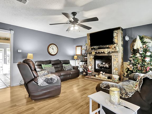 Wonderful Spacious home is located just minutes from the North Fork River and has several outbuildings on over 9 acres! The home has 3 bedrooms and 2.5 baths with wood and tile flooring throughout. Natural stone fireplace has a gas log insert and beautiful rustic wood mantle. The primary suite has a full bath, large walk-in closet, and plenty of natural light. Stained wood cabinets with a large pantry in the Kitchen, a formal Dining room, and spacious sunroom with panoramic views complete the home. Outside is an adorable treehouse with electric, a guesthouse, RV hookup, storm shelter, chicken coop with goat shed, and 2 storage buildings that both have electric. This property has a generous amount of highway frontage and is just a short drive to the lake, or great shopping and restaurants.