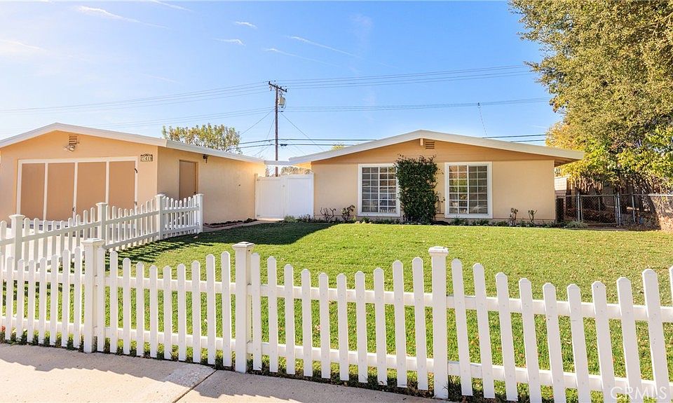 3 bedroom, 1230 sq. ft. single story, pool home with an approximately 200 sq. ft. enclosed sunroom on a beautiful tree lined street. The property features a fully vinyl fenced front yard, a a vinyl gated courtyard/backyard area with a newly plastered sparkling pool. Inside is a spacious living room w/vaulted ceiling, a kitchen with ample counter space, gas cooktop, stainless steel refrigerator, and an eating area that has 2 doors that provide access to the side yard, and also a sliding glass door that leads to the enclosed sunroom and laundry area. In the hallway is a central bathroom with tub/shower, and 2 additional bedrooms with vaulted beam ceilings. The 3rd and primary bedroom has vaulted ceilings, a bathroom, and large windows for a nice view outside. There is a also 2 car garage that is currently used as a studio setup that can be accessed via the courtyard area.. The exterior of the property was fully repainted, and the pool was also re-plastered, with new water line tiles and drains installed in December 2024. The home has updated windows, central A/C, and an updated electrical panel. NO HOA, and close to local parks, and retail.