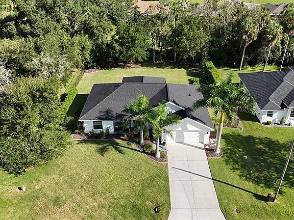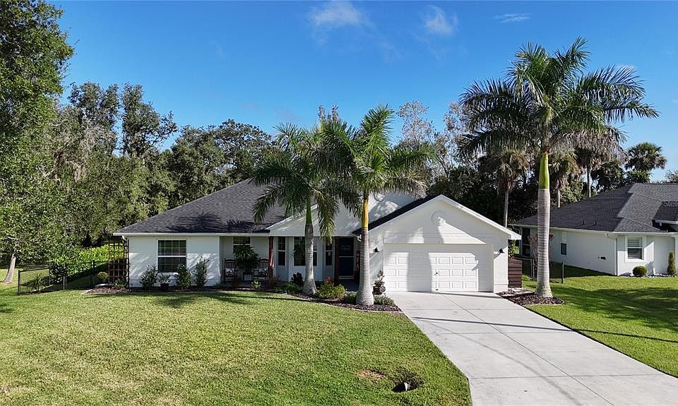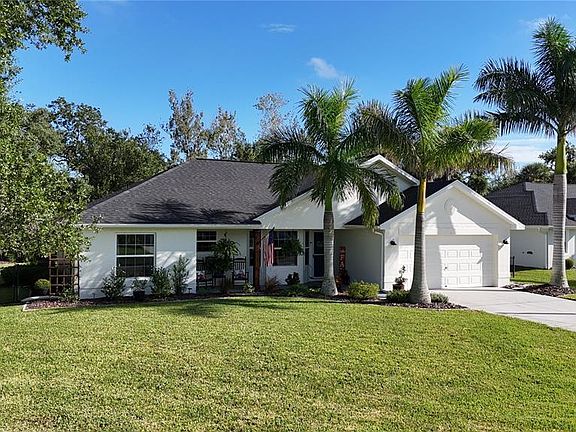 **3D Tour** Welcome Home to Deep Creek! This charming 3-bedroom, 2 bath, 2 car garage home is nestled on an OVERSIZED lot with easements to the rear and side providing rare added privacy. From the moment you arrive, you’ll feel the pride of ownership throughout. The 2023 roof ensures peace of mind & the lush tropical landscaping is complete with low voltage lighting, curbing, irrigation system, palms, flowering plants & even a flagpole! A covered front porch is the picture-perfect spot for a porch swing where you can sit & relax while enjoying your morning coffee & the gorgeous Florida weather. Wood beams align the front entrance & welcome you to the place you’ll call “home.” Open the front door to a warm and welcoming foyer with farmhouse charm. This home features tasteful upgrades - including modern lighting, ceiling fans, wood accents and soaring, vaulted ceilings. The open-concept layout showcases Pergo wood floors throughout which soaks in the natural light from the abundance of windows. The heart of the home is the spacious Great Room—perfect for game day, family nights, or relaxed entertaining. The decadent kitchen is a cook’s dream, featuring granite countertops, an ornate tile backsplash, plant shelves, wood cabinetry with crown molding, recessed lighting, and a custom country-style pantry door. Stainless steel appliances and an oversized breakfast bar offer both style & functionality. A cozy dinette nook with triple windows is the ideal spot for casual meals or evening unwinding. The laundry room is fully equipped with cabinetry & wood shelving, and yes, the washer and dryer are included! The split floor plan ensures privacy, with the owner's suite tucked away on its own side of the home. This retreat offers Pergo flooring, a wainscoting-accent wall, walk-in closet, & custom barn doors leading to a fully remodeled en-suite bath. The bathroom is a showstopper with dual sinks, subway tile shower with pebble flooring, shiplap walls, wood ceiling & thoughtful touches like towel hooks & framed mirrors. Two additional guest bedrooms are spacious & bright, each with ceiling fans & ample closet space. The guest bathroom is equally stylish, offering a tub/shower combo & elegant vanity—perfect for family or visitors. Step through to the backyard & let your Florida lifestyle truly begin! The covered & screened lanai is perfect for outdoor dining or relaxing with a good book. Beyond that, the NEWLY BUILT 24x24 paver patio surrounded by pebble rock, lattice & greenery offers a stunning space for grilling, entertaining, or gathering around a firepit under twinkling string lights that create an unforgettable ambiance. The fully fenced backyard is a dream for kids & pets alike—with dog doors already installed for your furry friends. The epoxy-finished garage is a handyman’s paradise, complete with built-in upper/lower cabinets & attic access with plywood flooring & lighting for additional storage. This home isn’t just a place to live—it’s a place to make memories. Whether you're hosting weekend BBQs, enjoying peaceful evenings under the stars, or exploring the best of Southwest Florida, this home has it all. Located in a friendly, deed-restricted neighborhood close to I-75, top-rated schools, shopping, dining, parks, golf, boating, and just a short drive to historic downtown Punta Gorda with its charming events, waterfront, and arts scene. Don’t miss out—schedule your private showing today and make this stunning property your next home!