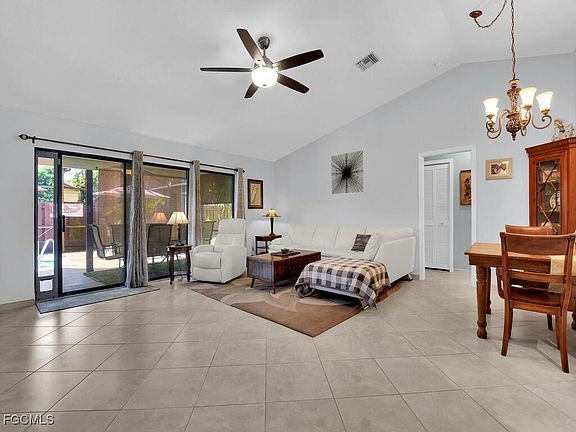 Single family pool home NOT IN A HIGH RISK FLOOD ZONE (Zone X) & NO HOA! Meticulously cared for and updated w/ all newer appliances & kitchen sink, NEW hot water heater(2025), custom murals on privacy walls, & whole home Culligan water filter system & softener. You will love the open floor plan of the home w/ cathedral ceiling, tile flooring throughout, large closet systems, long screened front entry, courtyard area in front of home, split bedroom & great room design, spacious kitchen w/ breakfast nook area & pantry, attached 2-car garage w/ full size fridge & laundry area, huge screened rear lanai w/ pool & covered sitting area, and a fenced in backyard w/ storage shed & fruit trees (banana, mango, lemon, avocado, coconut). For storm protection the home offers impact resistant windows w/ exception of sliders to lanai, there are manual shutters for those. Situated in a well-established non-gated neighborhood in the heart of Bonita Springs that is known for its close proximity to the beach, easy access to I-75, and is just a short bike ride or drive to the Bonita Springs River Park/Downtown area where you can find activities for the entire family!
