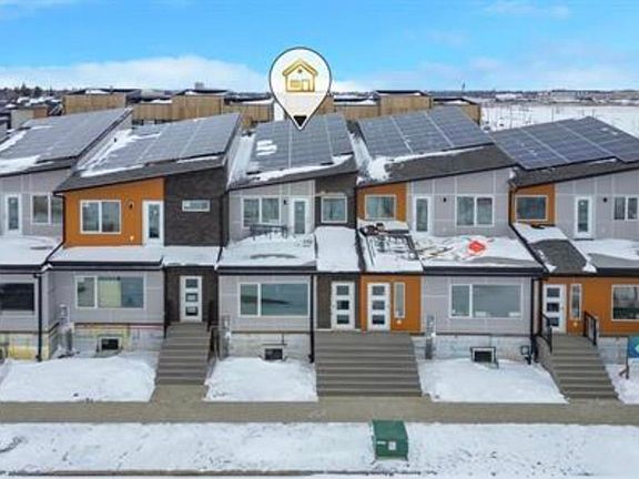 NET-ZERO two-storey home offering 1,428 sq.ft. above grade with 3 bedrooms, 2.5 baths & thoughtful energy-efficient design. Powered by SOLAR panels (renewable electricity) & finished with QUARTZ countertops, custom kitchen cabinetry & luxury vinyl plank flooring. Built with durable, fire-resistant exterior cladding & energy-efficient windows & doors for long-term performance & comfort, plus significant utility savings. Bright, open layout designed to maximize natural light, featuring a 10-ft wide living room window with views of the park, community garden, fire pit, and fruit orchard, plus additional windows over the stairwell and glazed doors throughout. Main floor includes a bedroom with closet and ensuite featuring a soaker tub, while two additional bedrooms are located on the second storey. Enjoy a large second-storey balcony with a view. Six energy-efficient appliances included, including a heat pump dryer. Laundry located in the basement. EV-ready garage with Level 1 & 2 wiring. No Condo Fees.