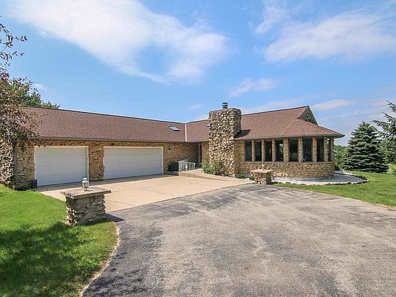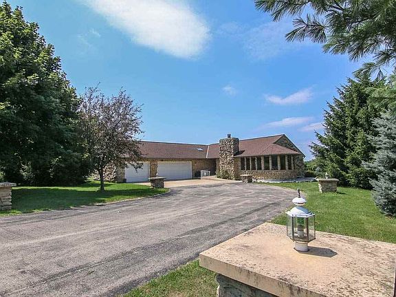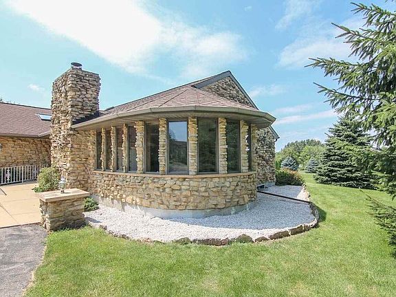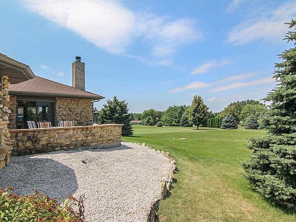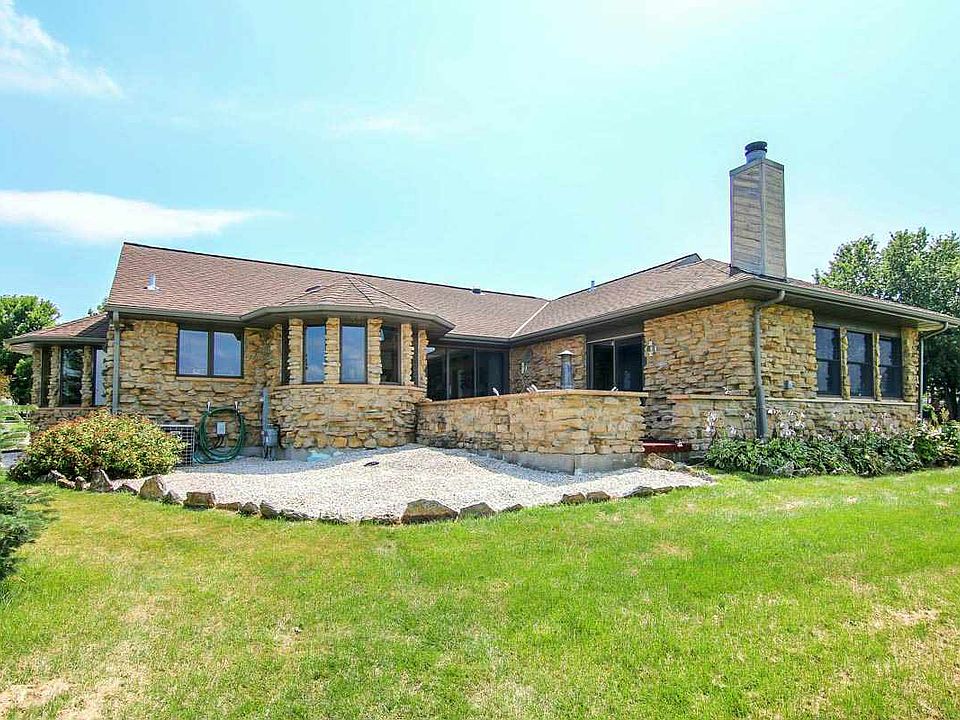 This beautiful stone 3-bed ranch sits perfectly on 1+ acres. Open floor plan w/ ample space to entertain. Kitchen features: granite countertops, breakfast bar, exquisite hardwood flrs, large island, tile backsplash, & bonus dinette that seats 5. The dining and great room have stunning windows with gorgeous views! Other features include: 2 fireplaces, 6-panel drs, oversized closets, 3-car garage. Beautiful patio area to grill & play. Enjoy the master ste that boasts a large WIC and full private bathrm. Full basement to finish as you wish! You will appreciate the rhubarb and raspberry bushes.