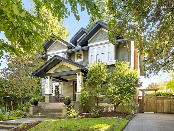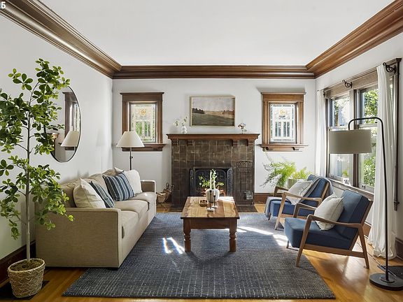 Historic Irvington Craftsman on a quiet, tree-lined street—rich with period detail: original millwork, box beams, pocket doors, and gorgeous stained glass. This 6 bedroom, 3 bath home boasts a flexible layout with a main-level (non-conforming) bedroom + en suite, plus four light-filled bedrooms upstairs with built-ins, an original sleeping porch, and a full bath. The 2013 third-floor primary retreat features vaulted/beamed ceilings, two walk-in closets, skylights, a reading nook, and a spa-like bath with a large tiled shower, heated plank-tile floors, and double vanity. Lower level offers two rec/flex rooms, a big storage room, and laundry. Charming fenced yard with raised beds and patio—perfect for morning coffee or evening gatherings. A must see! Open Sat 10/11, 12–3pm & Sun 10/12, 1–3pm. [Home Energy Score = 1. HES Report at https://rpt.greenbuildingregistry.com/hes/OR10242320]