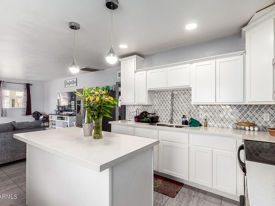Fantastic opportunity to own this charming 3-bed, 2-bath home in a great Phoenix location! Inside, you'll find a desirable open layout perfect for everyday living & entertaining. Abundant natural light, designer paint, and tile flooring throughout are some features that can't be left unsaid. The open-concept kitchen boasts SS appliances, quartz counters, a stylish tile backsplash, white shaker cabinetry, recessed & pendant lights, and an island w/breakfast bar. Enter the large main bedroom to discover a walk-in closet & a private bathroom for added comfort. The spacious backyard has a storage shed & a sizable open patio! With your creative ideas, you can make it a complete outdoor oasis. Fully fenced property with two RV gates, one in front & one in the rear from the alley. Make it yours!