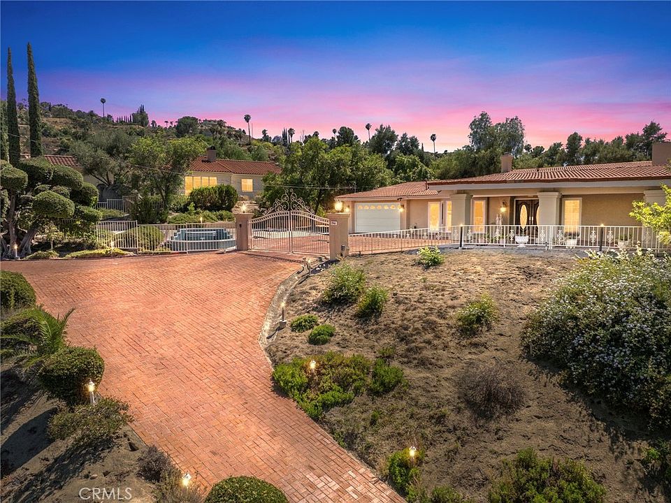 BACK ON THE MARKET! NEWER CERTIFIED SEPTIC! Surrounded by multiple pomegranate, peach, and citrus trees, this home, nestled on 1.1 acres of picturesque land, offers a seamless blend of elegance and functionality. Spanning 4,250 square feet of SINGLE STORY living space, this home is an EXTREMELY RARE find! As you enter the grand foyer adorned with a striking combination of Chinese and Italian tile, you are greeted with opulence at every turn! Two marble fireplace mantels add a touch of warmth and sophistication that complement the Italian murals, exquisite finishes and lovely wall paper throughout the residence. The heart of the home is its chef’s kitchen, meticulously designed for culinary enthusiasts. This kitchen has a ton of potential as it already features an elegant dining area with very large marble table strategically positioned in front of a large picture window, marble countertops, multiple appliances to include a double refrigerator, electric and gas cooktops, double ovens, as well as dual pantries, and abundant storage with pull-out drawers for dishes and smaller kitchen appliances, as well as glass cabinets to showcase your cherished pieces. The home is complete with a formal living room and a formal dining room, both waiting behind French Doors, and a spacious family room, all presenting magnificent chandeliers to captivate your guests! With five bedrooms and three and a half bathrooms, including a master ensuite that exudes tranquility and comfort, the home provides all of the space for any living situation and even has ample closet space to meet storage needs. Entertain effortlessly on the expansive outdoor brick patio, perfect for large events, which spans the length of the home and offers breathtaking views of the surrounding mountains, OR spend time on the beautiful green, shady side-yard with a second outdoor patio and fire pit, both perfect for hosting gatherings or enjoying serene moments outdoors. Additional features include: A lighted brick driveway on timers, a sprinkler system around the property, and covered approach and space for ample outdoor parking (at least 6 vehicles) and a two-car garage with maximum cabinet storage to ensure both convenience and organization. Take a look at this executive home today to discover unparalleled design and unlimited potential for your own personal touches in this Mediterranean-inspired sanctuary!