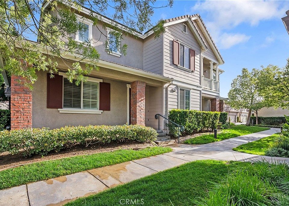 Beautifully maintained and updated Valencia Creekside townhome—featuring the largest floor plan in the community and one of the few with a downstairs 4th bedroom and bathroom! Offering 4 bedrooms, 3 bathrooms, a 2-car garage, and a spacious private patio, this home has been freshly updated with new interior paint throughout the living space. A lush front yard and welcoming covered porch into a bright, open living room complete with a ceiling fan, cozy fireplace and plantation shutters. The thoughtful layout includes a downstairs bedroom and ¾ bath—perfect for guests, multigenerational living, or a private home office. The living space flows seamlessly into the dining area and open kitchen. A newly updated kitchen is a true showpiece, blending modern design with everyday functionality. Bright and airy with recessed lighting, it features a large center island with crisp white quartz countertops, perfect for meal prep or casual dining. The two-tone cabinetry offers a stylish contrast—deep green lower cabinets accented with sleek gold hardware, paired with clean white upper cabinets for a timeless look. A farmhouse-style apron sink sits beneath a sunlit window, complemented by a designer hexagon tile backsplash that adds a subtle touch of elegance. The kitchen is complete with stainless steel appliances, including a gas range and dishwasher, as well as ample cabinet and drawer storage. A sliding glass door off the kitchen opens to a large private patio with a natural gas BBQ hookup and planter area—ideal for entertaining or relaxing outdoors. Upstairs, you’ll find three more generously sized bedrooms and two full baths. Each bedroom is appointed with neutral-colored carpeting. The hallway bath offers a dual-sink vanity, while the spacious primary suite features a large walk-in closet and a spa-like bathroom with dual vanities, a soaking tub, walk-in shower, and even its own ceiling fan for added comfort. Residents of Creekside enjoy resort-style amenities including two pools and spas, a clubhouse, barbecues, scenic paseos, security patrol, and beautifully landscaped greenbelts. Best of all, this home has NO Mello-Roos and is ideally located near Valencia Heritage Park, award-winning schools, shopping, dining, and more. Don’t miss this rare opportunity to own one of Creekside’s most desirable homes!