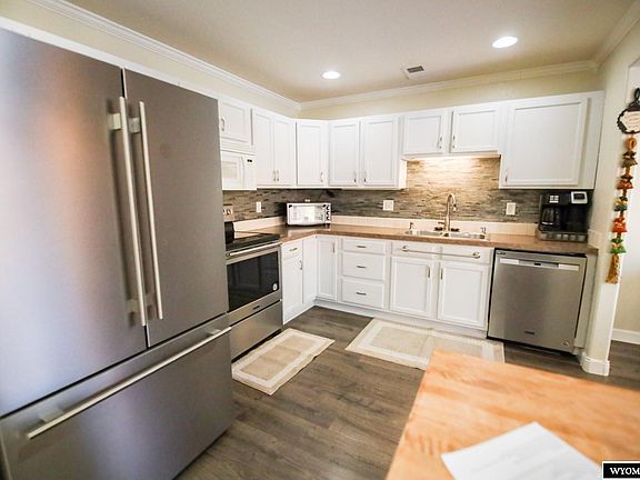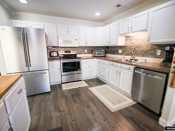 MOVE IN READY! 3 spacious bedrooms, with an owners suite on the main level. Huge closets and roomy bathrooms. The open floor plan features beautiful vaulted ceilings in the living room, which flows into the dining room and kitchen. An updated tile backsplash complements the new easy clean stainless steel appliances, and there's plenty of storage with the butcher block island and hanging pot rack. Newer laminate flooring throughout the main.