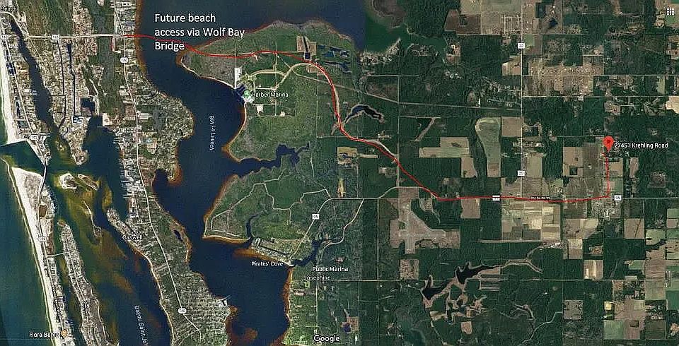 Farmhouse style cottage with open/split layout on 5 acre wooded lot! Well separated living and sleeping areas easily accommodate families and night owls alike. Piney wooded 5 acre lot offers lovely natural landscape and privacy, adorned with magnolias, oaks and banana plants. Just minutes from Pirates Cove, Barber and Josephine marinas, Foley Beach Express, The Wharf, and OWA amusement park. House has master suite including walk in closet, private deck and bath. Custom lighting with dimmers allows you to set lighting to perfection. Open floor plan has a chef's kitchen with island, sunroom, and several options for TV location. There is a laundry room accessible from both bathrooms. The second BR also has a private deck. Water is included but tenant pays electric heat and AC. Landlord references required.