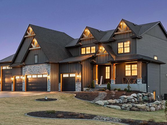 Inside, you’re immediately greeted with high-end finishes throughout, including a custom chef’s kitchen with a walk-in butler’s pantry featuring an additional oven, dishwasher, and ample storage, a stylish formal dining area, and a comfortable living room with panoramic views of the property. A charming porch with fireplace and adjacent beverage bar adds to the entertaining attributes of this stunning home. Upstairs, the primary suite wows, designed for comfort with a soaking tub and large walk-in closet (don't miss the champagne fridge!). Two more bedrooms, both with walk-in closets and private en suite bathrooms, as well as a spacious laundry room take this upper floor to the next level. Looking for room to grow? The home’s design allows for a future upper-level bedroom addition above the second and third garage stalls. Downstairs, an entertainer’s dream – a generous family room with three TV's and gaming area sit adjacent to the wet bar with custom tile, the ideal locale to watch your favorite events. Floor-to-ceiling windows bathe the lower level in natural light. Need to shoot some hoops? No problem – practice your moves in the half-court exercise room/ sport court for year-round fun.