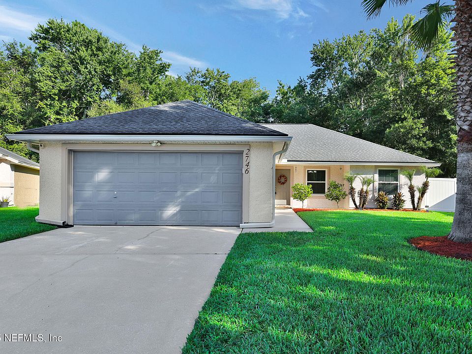 Inside, the living room boasts vaulted ceilings and a cozy wood-burning fireplace, flowing seamlessly into the kitchen and dining area—perfect for everyday living and entertaining. Step outside to your private retreat with a sparkling pool, freshly coated patio, and gravel fire pit for evening relaxation. Fruit trees and a blueberry bush add charm to the backyard. Additional highlights include location in the sought-after Fleming Island High School district, no HOA or CDD fees, and a peaceful setting. This home is move-in ready and waiting for its next owner.