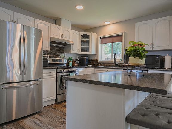 Scenic walking trailsCozy gas fireplaceBright kitchenWhite cabinetryGas rangeStainless steel appliancesFully fenced yard